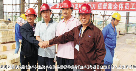 集團(tuán)公司副總裁趙強(qiáng)、煤化工項(xiàng)目總指揮李正平及該項(xiàng)目總經(jīng)理趙寶元等參加了筑爐儀式,并為焦?fàn)t砌下第一塊磚。